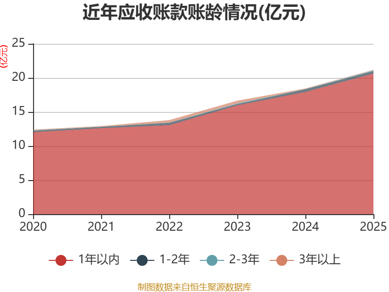 从应收账款账龄结构来看,截至2025年末,公司账龄在1年以内的应收账款余额为20.62亿元,较上年末增长2.7亿元,占应收账款总额比例为97.43%,较上年末上升0.15个百分点。