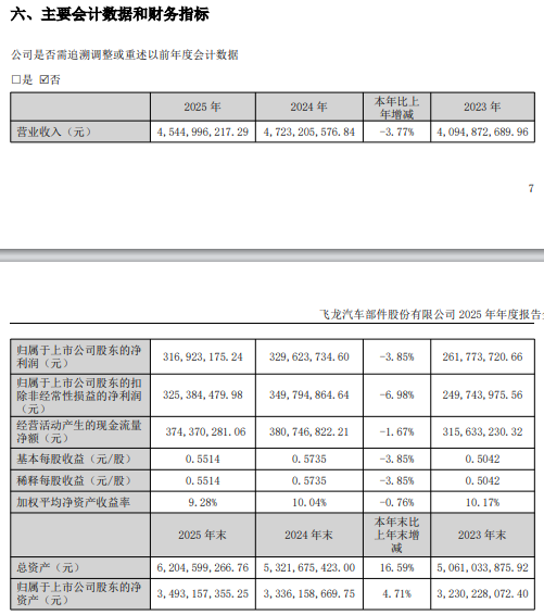 3月19日晚间,飞龙股份(002536)公布2025年年报,公司营业收入为45.45亿元,同比下降3.77%;归母净利润为3.17亿元,同比下降3.85%;扣非归母净利润为3.25亿元,同比下降6.98%;经营现金流净额为3.74亿元,同比下降1.67%。公司拟向全体股东每10股派发现金红利3元(含税)。