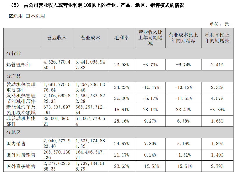 年报显示,报告期公司传统燃油车业务大幅下滑,成为营收主要拖累因素。其中,发动机热管理重要部件营收16.62亿元,同比下降10.47%;发动机热管理节能减排部件营收21.07亿元,同比下降6.17%。以上两大业务合计营收占比83%,直接拉低整体营收。