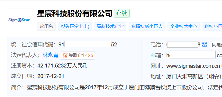 天眼查显示,星宸科技成立于2017年12月,位于福建省厦门市,2024年3月在深交所创业板上市,专注于端边侧AI SoC芯片的研发、设计与销售,产品覆盖智能安防、智能物联、智能车载三大核心领域,采用Fabless无晶圆厂的经营模式。