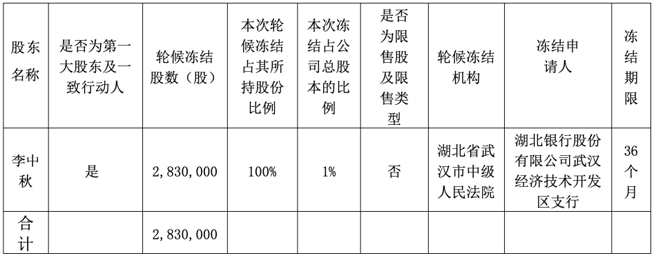 3月19日,深华发A(000020)发布公告,近日,公司接到控股股东通知,获悉控股股东武汉中恒新科技产业集团有限公司(以下简称“武汉中恒集团”)所持有本公司深华发A(股票代码:000020)无限售流通股116,489,894股被司法轮候冻结,实际控制人李中秋个人所持有本公司深华发B(股票代码:200020)无限售流通股283万股被司法冻结。