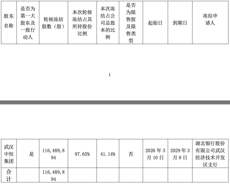 截至本公告披露日,公司控股股东武汉中恒集团持有公司A股股份119,289,894股(股票代码:000020),占公司总股本的42.13%。本次累计被轮候冻结116,489,894股股份,占公司总股本的41.14%,占武汉中恒集团持有公司股份的97.65%。冻结起始日为2026年3月10日,预计到期日为2029年3月9日。
