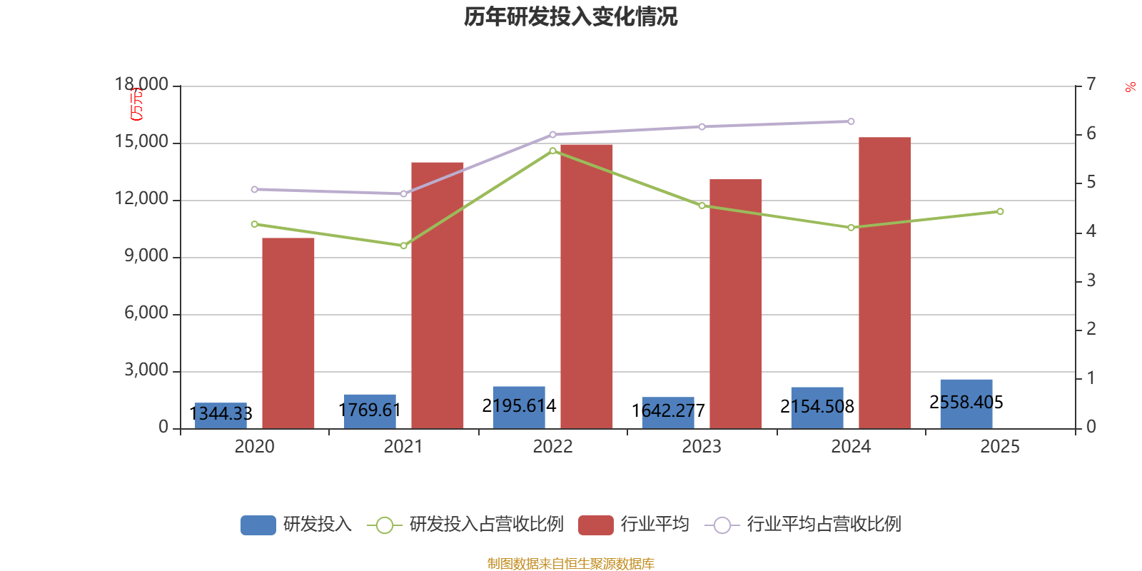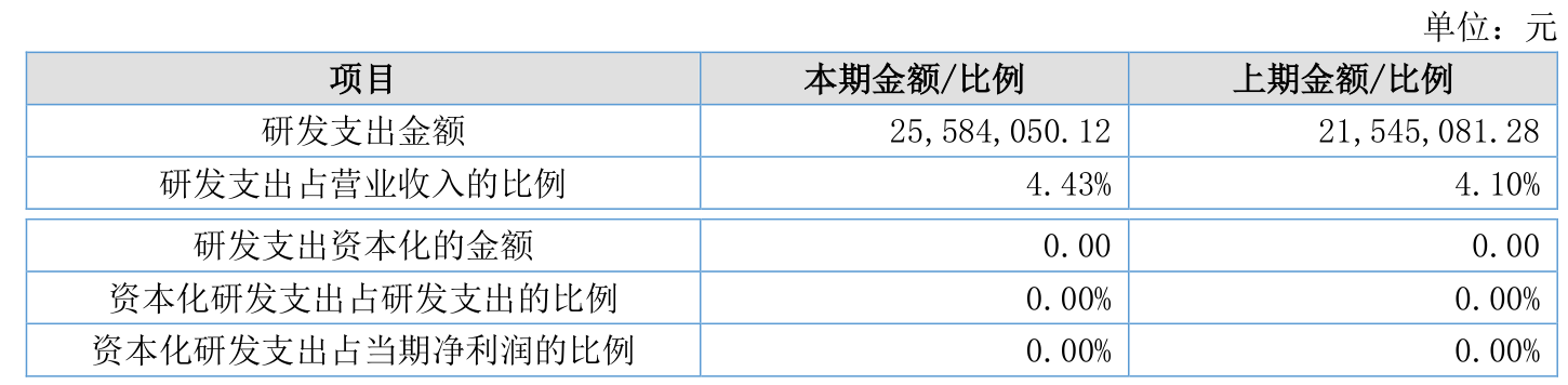 2025年全年,公司研发投入金额为2558.41万元,同比增长18.75%;研发投入占营业收入比例为4.43%,相比上年同期上升0.33个百分点。此外,公司全年研发投入资本化率为0%。
