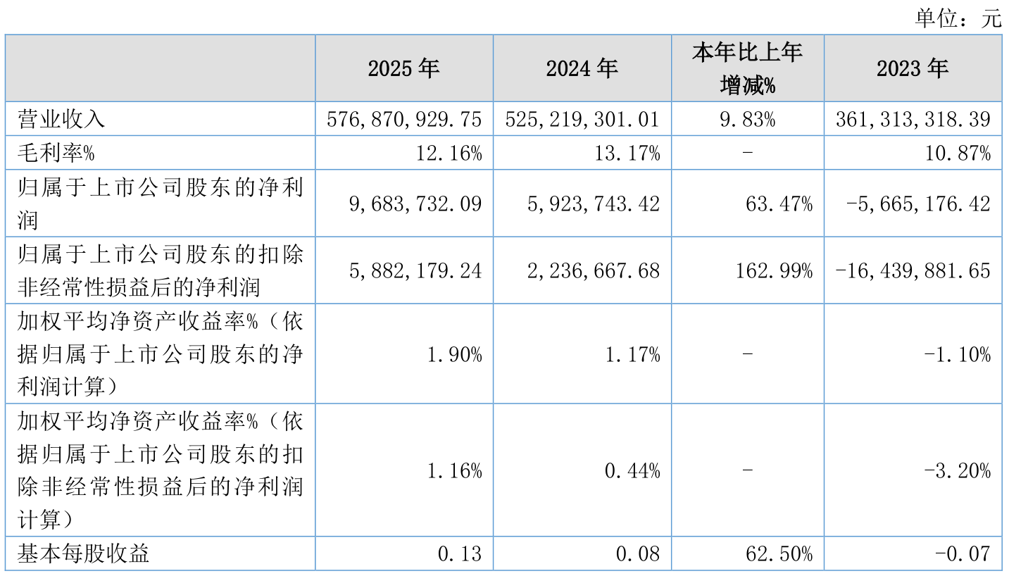 中证智能财讯晶赛科技(920981)3月19日披露2025年年度报告。2025年,公司实现营业总收入5.77亿元,同比增长9.83%;归母净利润968.37万元,同比增长63.47%;扣非净利润588.22万元,同比增长162.99%;经营活动产生的现金流量净额为8154.11万元,同比增长537.48%;报告期内,晶赛科技基本每股收益为0.13元,加权平均净资产收益率为1.90%。
