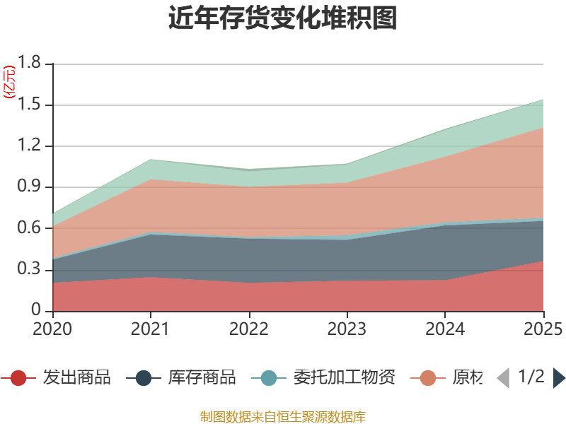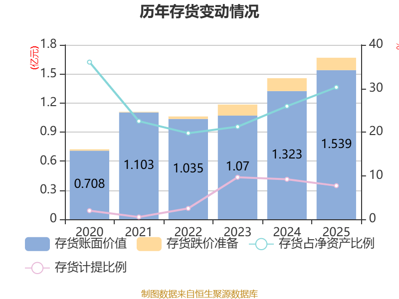 从存货变动来看,截至2025年末,公司存货账面价值为1.54亿元,占净资产的30.27%,较上年末增加2162.25万元。其中,存货跌价准备为1284.41万元,计提比例为7.7%。