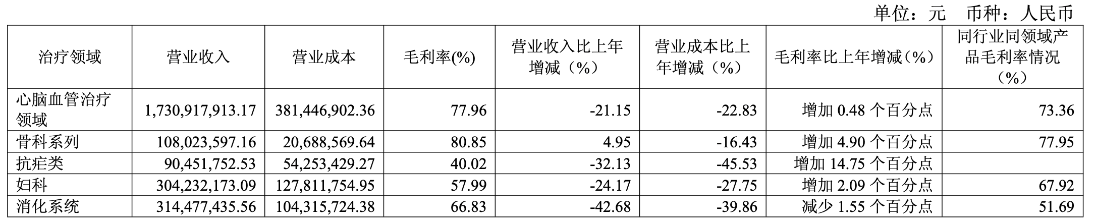 消化系统产品营业收入同比下降42.68%,主要是核心产品受零售市场动销放缓及阶段性客流波动影响,销售收入同比下降。