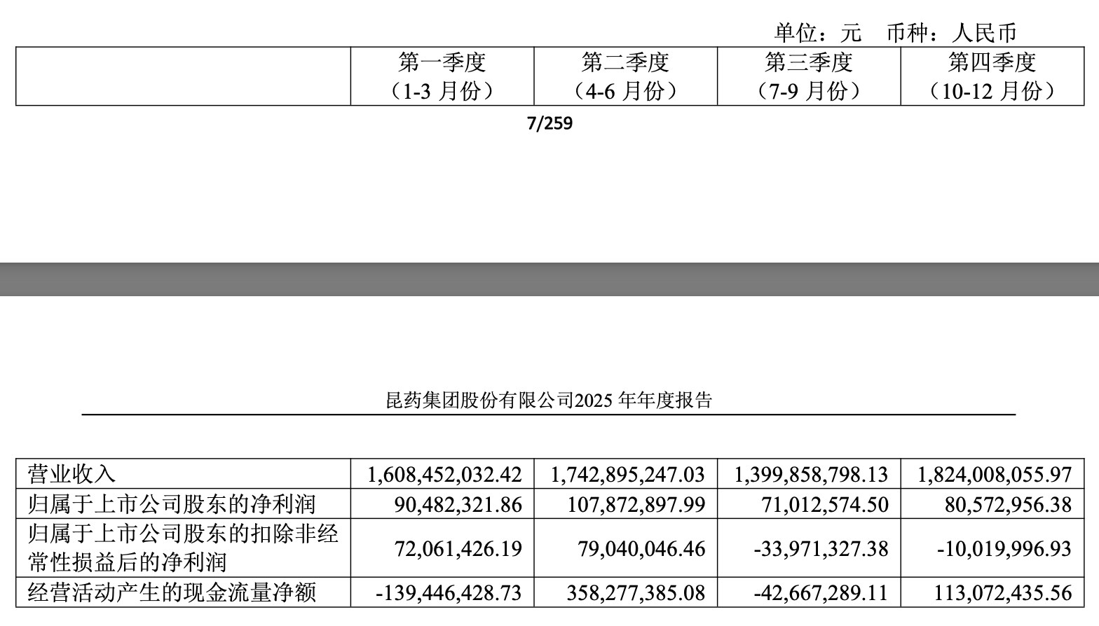 分季度来看,昆药集团2025年的四个季度,每个季度净利均同比下滑,第三、第四季度扣非净利更是出现了亏损,也就是说,在2025年下半年,昆药集团扣非净利亏损了4399万元。