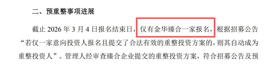 记者注意到,到3月4日报名结束日,仅有金华臻合一家意向投资机构有意愿参与小贝大美的重整项目。按照规则,若仅有一家投资者报名且提交有效方案,则自动成为重整投资人。