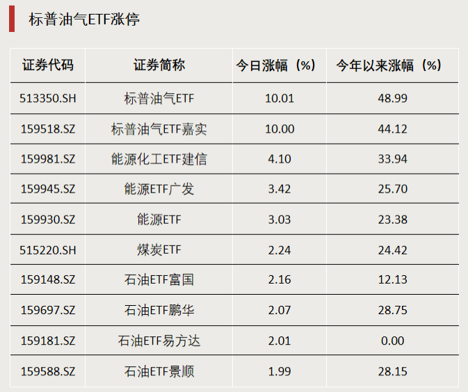 主投油气、能源、煤炭等方向的ETF逆势收涨。2只标普油气ETF尾盘逆势涨停,全天成交额均超40亿元,较前一交易日大幅放量。截至收盘,今年以来,2只产品均涨超40%,其中标普油气ETF(513350)涨幅已近50%。