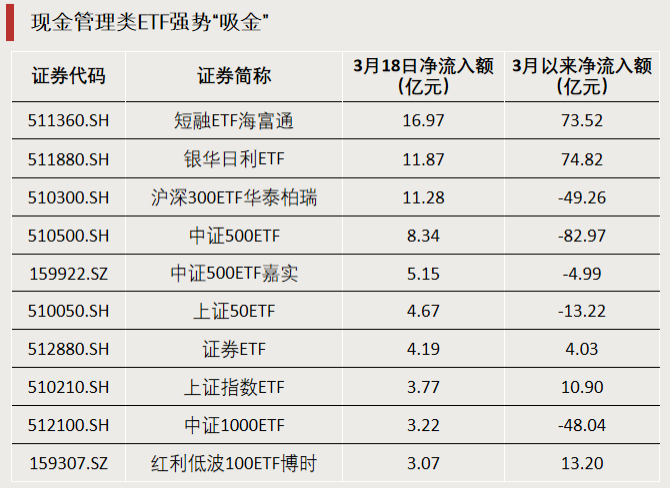 此外,3月16日至3月18日ETF资金整体连续净流出期间,沪深300ETF华泰柏瑞逆势“吸金”。3月17日、3月18日单日净流入额均超过10亿元。