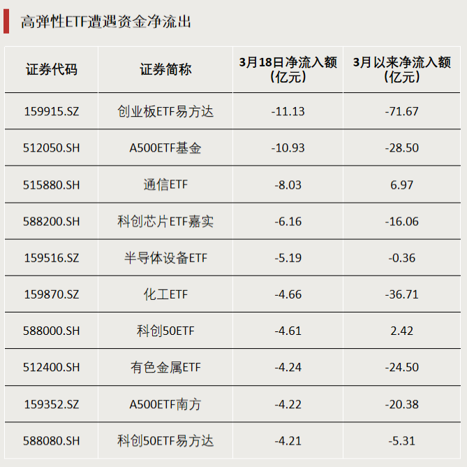3月18日资金净流出额居前十的ETF中,主投创业板、科创板等偏高弹性市场的ETF居多。截至3月18日,部分产品3月以来的资金净流出金额已超过70亿元。