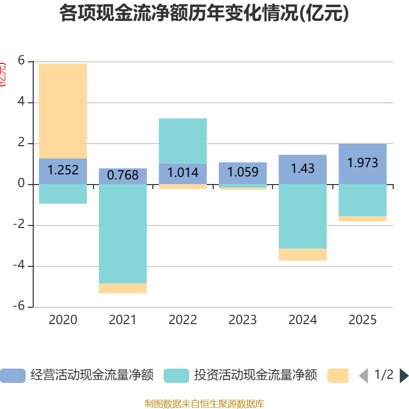 截至2025年,公司经营活动现金流净额为1.97亿元,同比增长38.02%;筹资活动现金流净额-2472.66万元,同比增加3298.28万元;投资活动现金流净额-1.57亿元,上年同期为-3.17亿元。