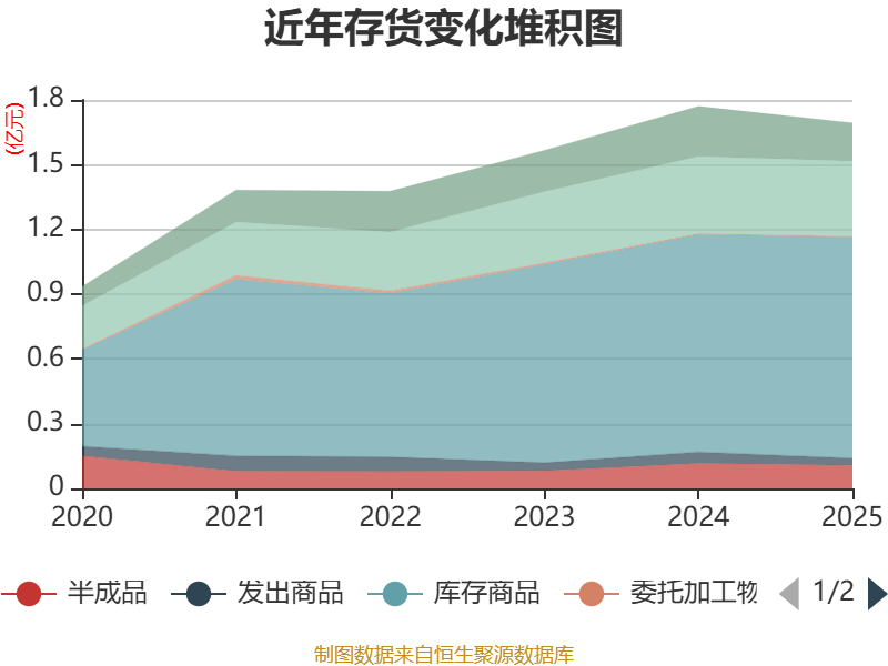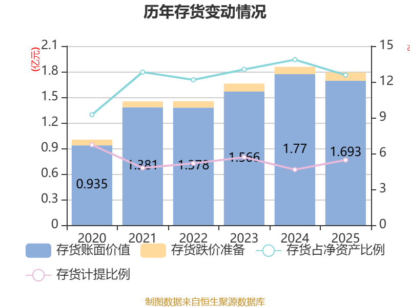 从存货变动来看,截至2025年末,公司存货账面价值为1.69亿元,占净资产的12.57%,较上年末减少764.17万元。其中,存货跌价准备为975.59万元,计提比例为5.45%。