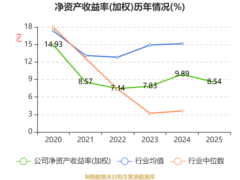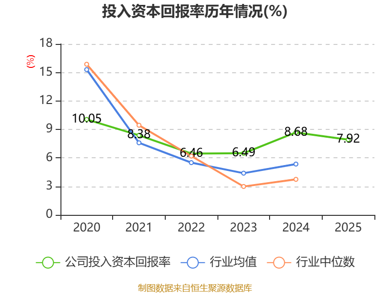 数据显示,2025年公司加权平均净资产收益率为8.54%,较上年同期下降1.35个百分点。公司2025年投入资本回报率为7.92%,较上年同期下降0.76个百分点。