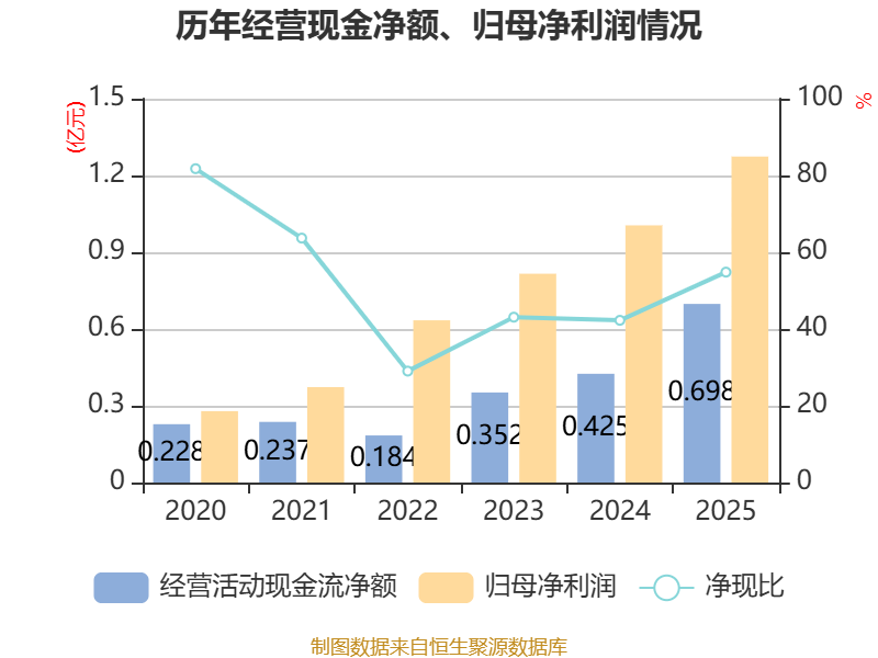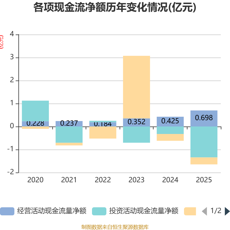 截至2025年,公司经营活动现金流净额为6982.65万元,同比增长64.37%;筹资活动现金流净额-3027.29万元,同比减少63.55万元;投资活动现金流净额-1.34亿元,上年同期为-3246.84万元。