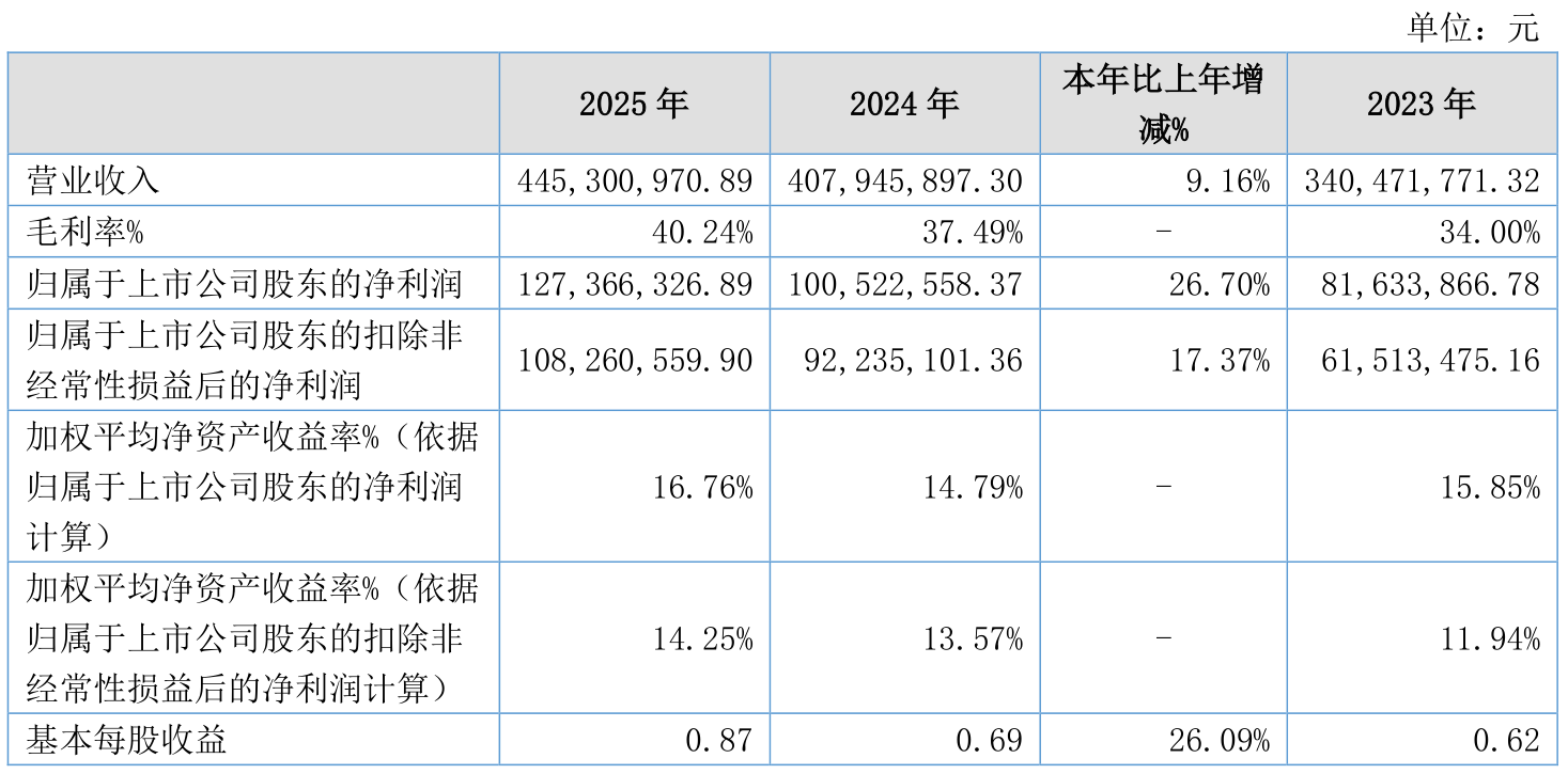 中证智能财讯民士达(920394)3月19日披露2025年年度报告。2025年,公司实现营业总收入4.45亿元,同比增长9.16%;归母净利润1.27亿元,同比增长26.70%;扣非净利润1.08亿元,同比增长17.37%;经营活动产生的现金流量净额为6982.65万元,同比增长64.37%;报告期内,民士达基本每股收益为0.87元,加权平均净资产收益率为16.76%。公司2025年度分配预案为:拟向全体股东每10股派现2元(含税)。