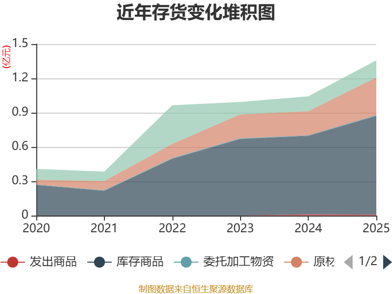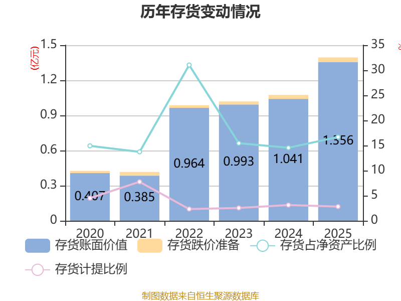 从存货变动来看,截至2025年末,公司存货账面价值为1.36亿元,占净资产的16.69%,较上年末增加3154.2万元。其中,存货跌价准备为392.94万元,计提比例为2.82%。