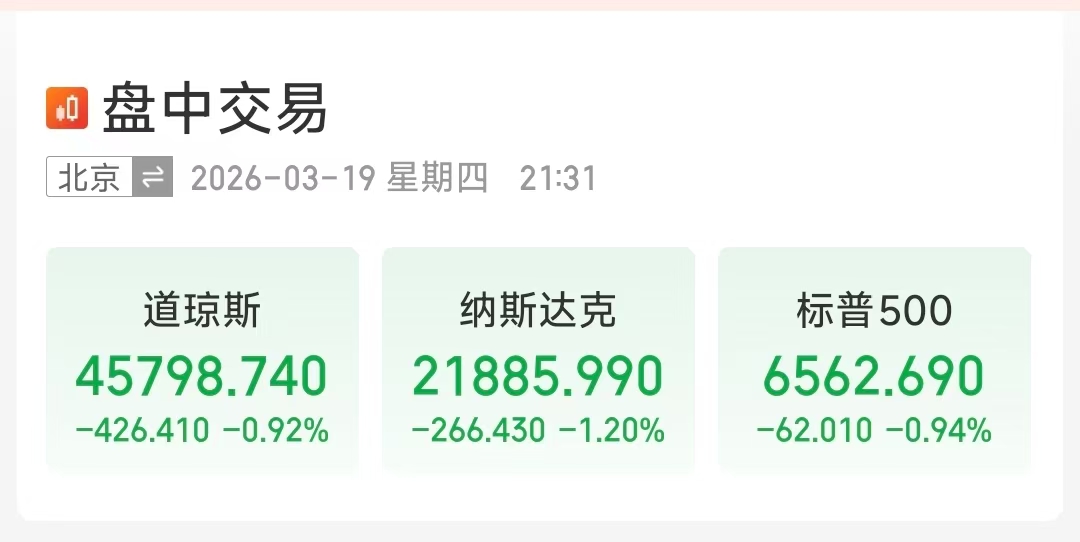 【大河财立方消息】3月19日,美股三大股指集体低开,道琼斯指数跌0.92%,纳斯达克指数跌1.20%,标普500指数跌0.94%。