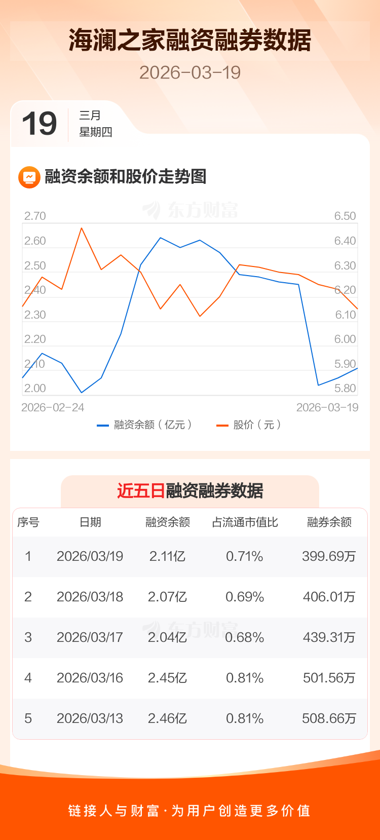 交易所最新数据显示,海澜之家于2026年3月19日获融资买入1358.75万元,融资偿还917.31万元,当日融资净买入441.43万元。目前,该股融资余额2.11亿,占流通市值比例为0.71%。