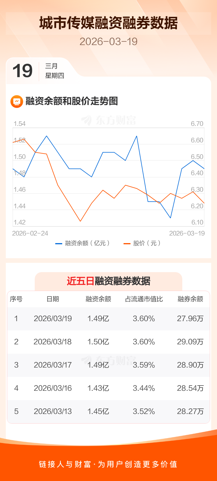 交易所最新数据显示,城市传媒于2026年3月19日获融资买入186.47万元,融资偿还327.17万元,当日融资净偿还140.69万元。目前,该股融资余额1.49亿,占流通市值比例为3.60%。