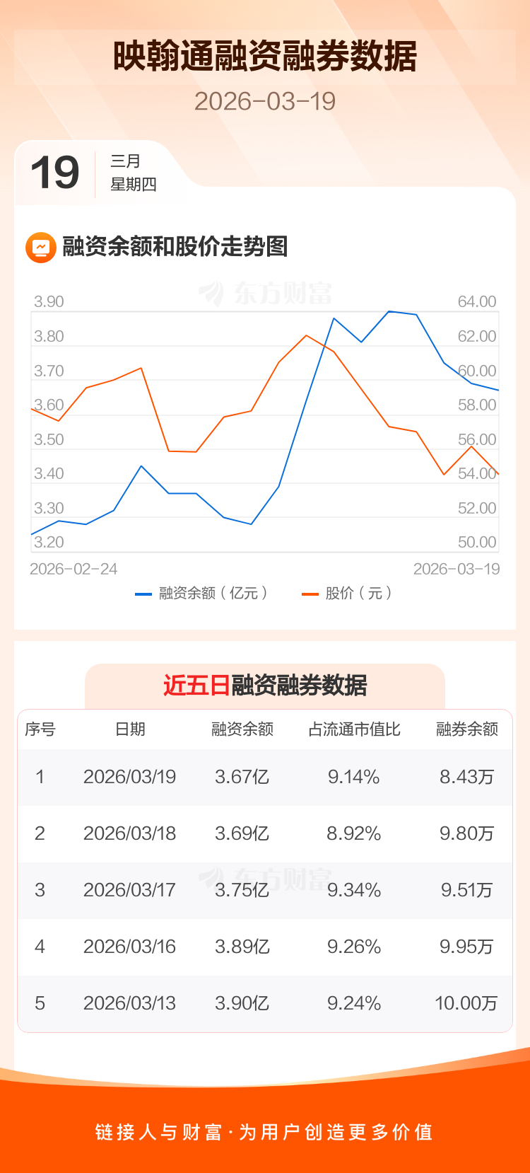 交易所最新数据显示,映翰通于2026年3月19日获融资买入1055.17万元,融资偿还1278.69万元,当日融资净偿还223.52万元。目前,该股融资余额3.67亿,占流通市值比例为9.14%。