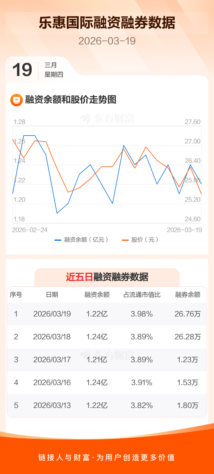 交易所最新数据显示,乐惠国际于2026年3月19日获融资买入772.19万元,融资偿还890.26万元,当日融资净偿还118.08万元。目前,该股融资余额1.22亿,占流通市值比例为3.98%。