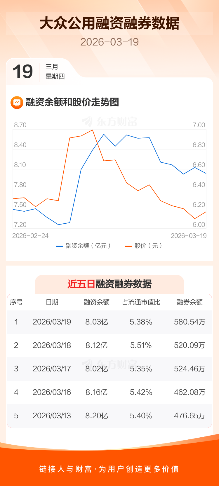 交易所最新数据显示,大众公用于2026年3月19日获融资买入3374.37万元,融资偿还4256.58万元,当日融资净偿还882.21万元。目前,该股融资余额8.03亿,占流通市值比例为5.38%。