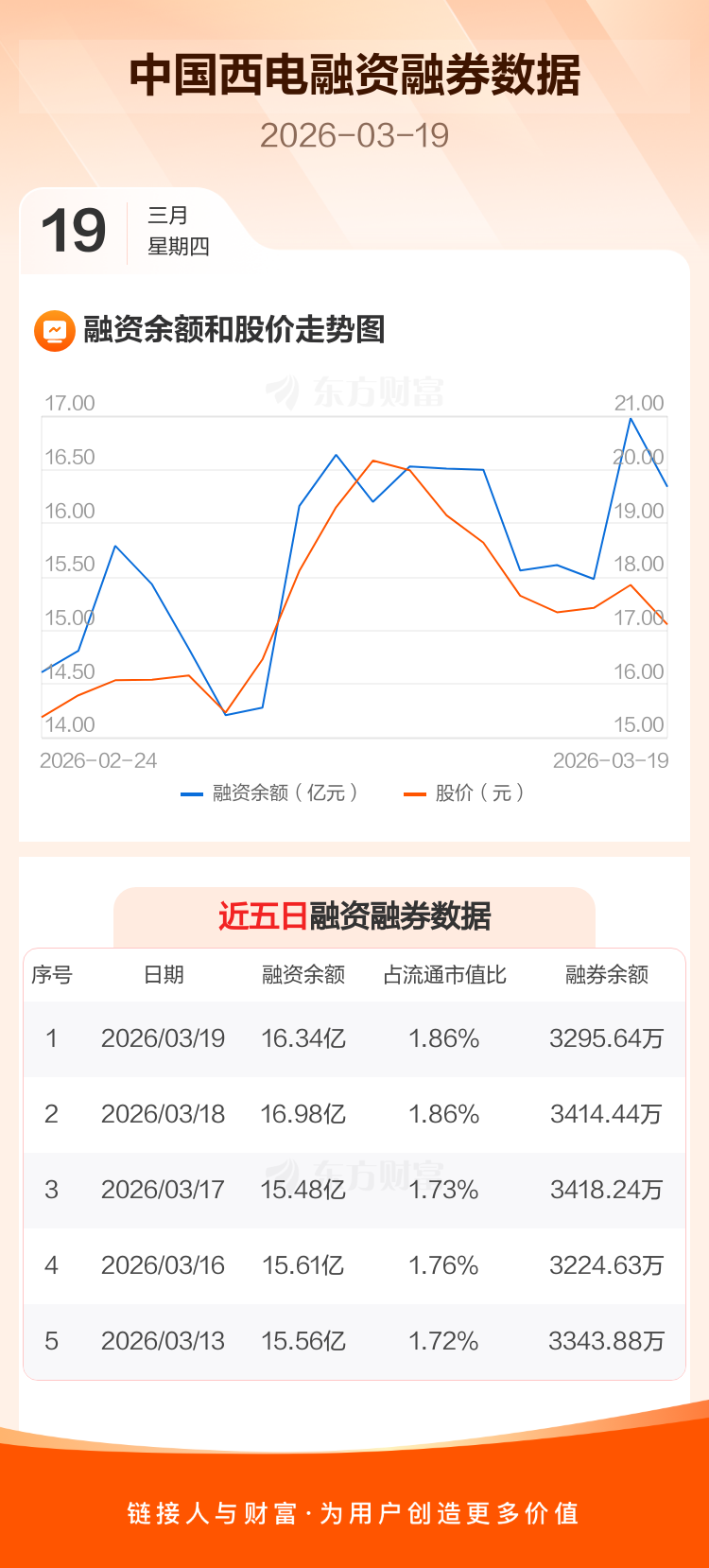 交易所最新数据显示,中国西电于2026年3月19日获融资买入2.76亿元,融资偿还3.41亿元,当日融资净偿还6474.86万元。目前,该股融资余额16.34亿,占流通市值比例为1.86%。