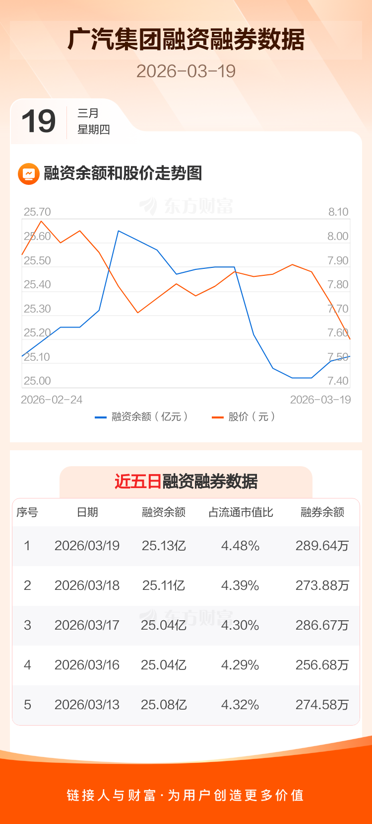 交易所最新数据显示,广汽集团于2026年3月19日获融资买入2122.65万元,融资偿还1986.51万元,当日融资净买入136.13万元。目前,该股融资余额25.13亿,占流通市值比例为4.48%。
