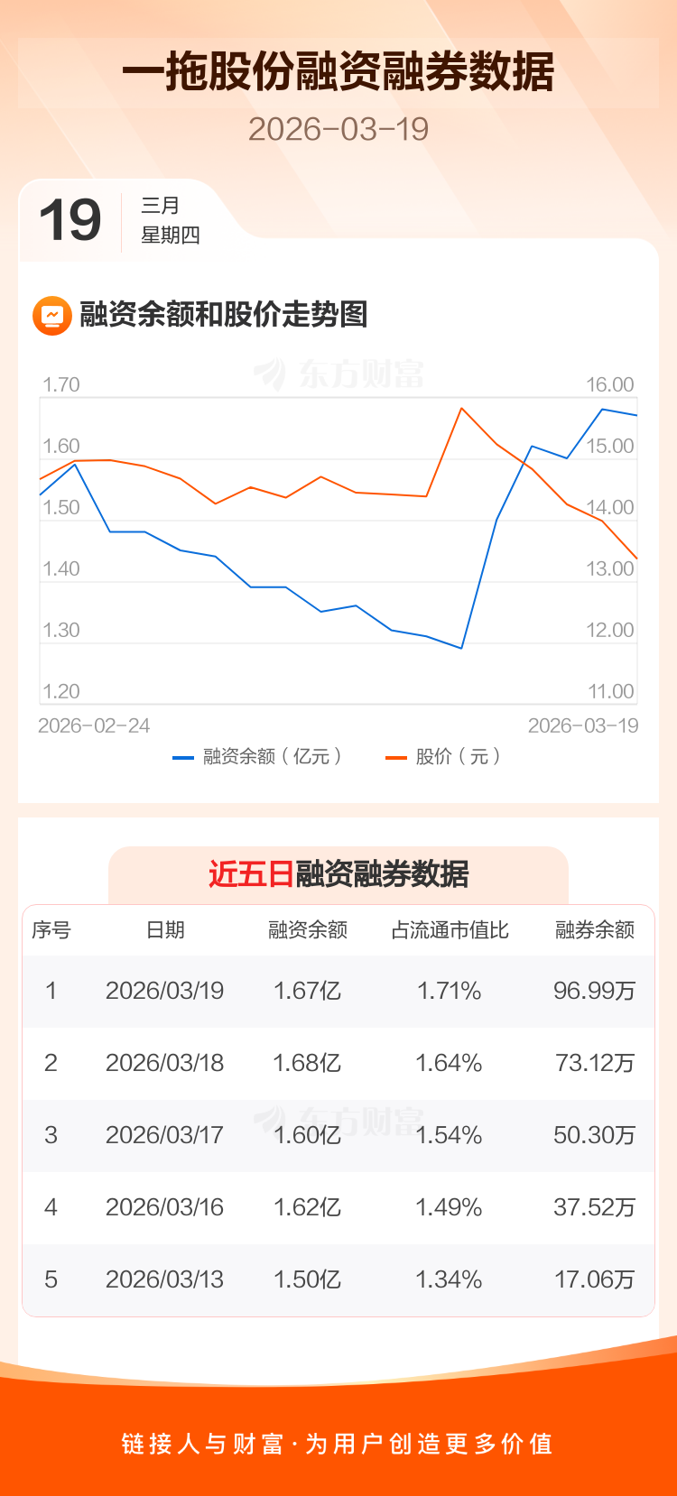 交易所最新数据显示,一拖股份于2026年3月19日获融资买入1701.55万元,融资偿还1760.27万元,当日融资净偿还58.72万元。目前,该股融资余额1.67亿,占流通市值比例为1.71%。
