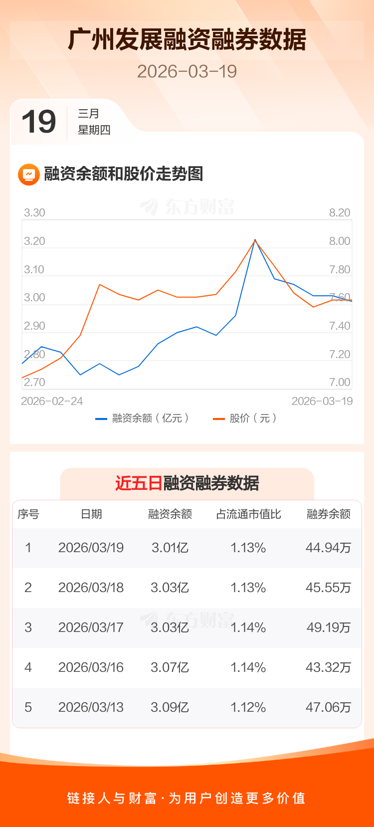 交易所最新数据显示,广州发展于2026年3月19日获融资买入1098.01万元,融资偿还1258.27万元,当日融资净偿还160.26万元。目前,该股融资余额3.01亿,占流通市值比例为1.13%。
