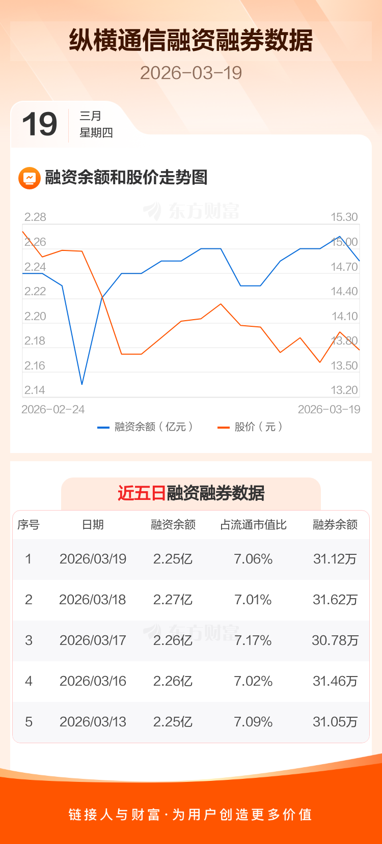 交易所最新数据显示,纵横通信于2026年3月19日获融资买入373.02万元,融资偿还584.13万元,当日融资净偿还211.11万元。目前,该股融资余额2.25亿,占流通市值比例为7.06%。