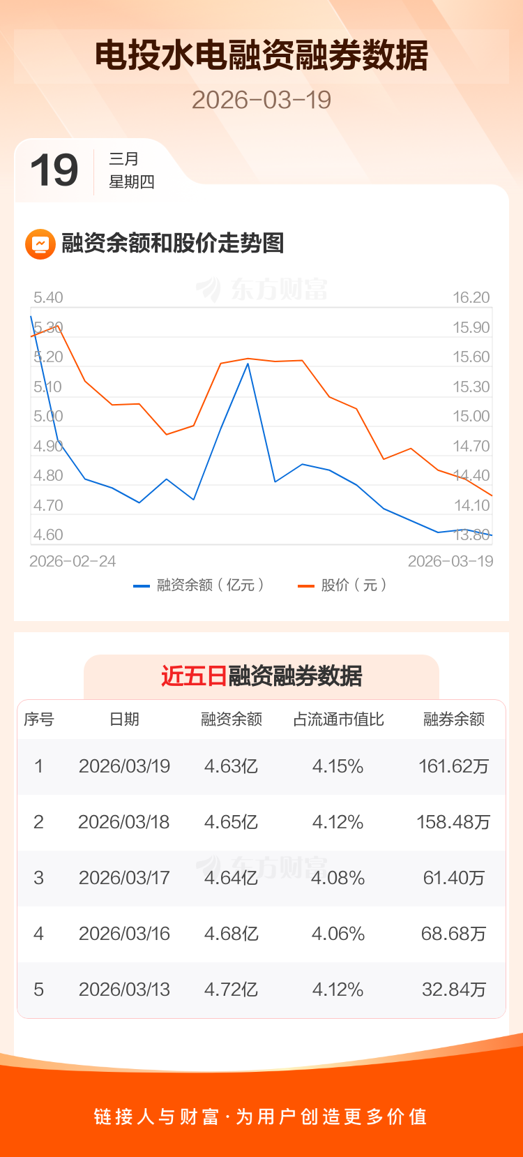 交易所最新数据显示,电投水电于2026年3月19日获融资买入1035.92万元,融资偿还1190.83万元,当日融资净偿还154.91万元。目前,该股融资余额4.63亿,占流通市值比例为4.15%。