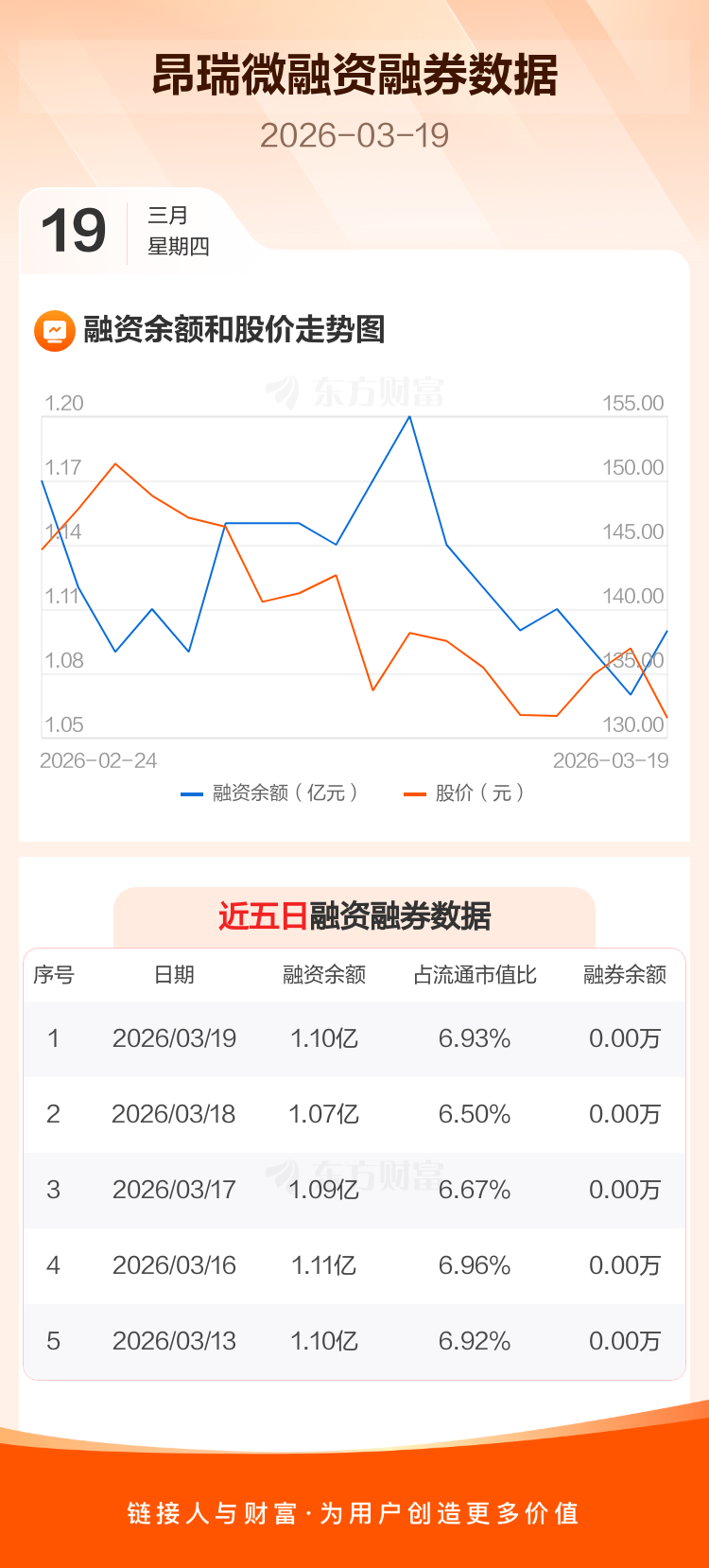 交易所最新数据显示,昂瑞微于2026年3月19日获融资买入813.68万元,融资偿还553.80万元,当日融资净买入259.89万元。目前,该股融资余额1.10亿,占流通市值比例为6.93%。