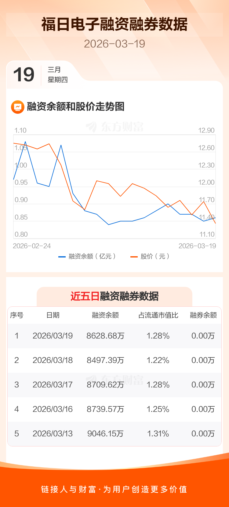 交易所最新数据显示,福日电子于2026年3月19日获融资买入506.12万元,融资偿还374.83万元,当日融资净买入131.29万元。目前,该股融资余额8628.68万,占流通市值比例为1.28%。