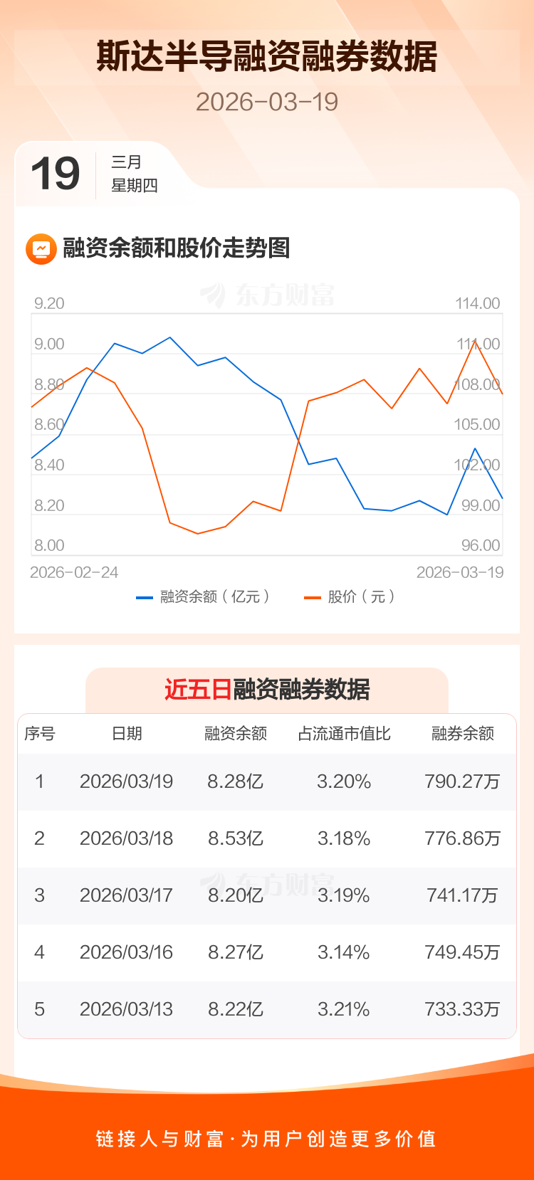 交易所最新数据显示,斯达半导于2026年3月19日获融资买入5768.49万元,融资偿还8228.81万元,当日融资净偿还2460.32万元。目前,该股融资余额8.28亿,占流通市值比例为3.20%。