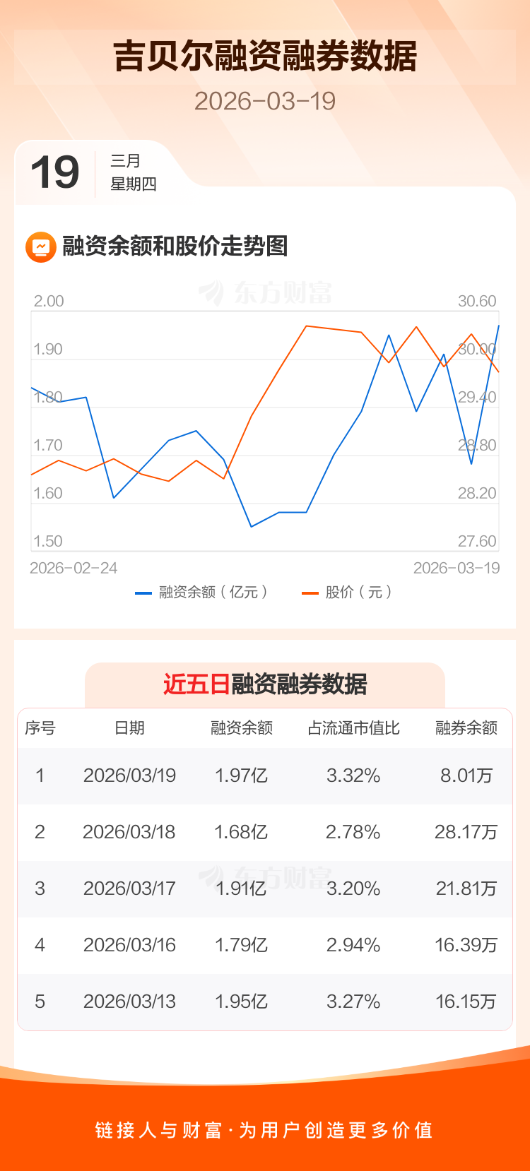 交易所最新数据显示,吉贝尔于2026年3月19日获融资买入4948.14万元,融资偿还2037.78万元,当日融资净买入2910.35万元。目前,该股融资余额1.97亿,占流通市值比例为3.32%。