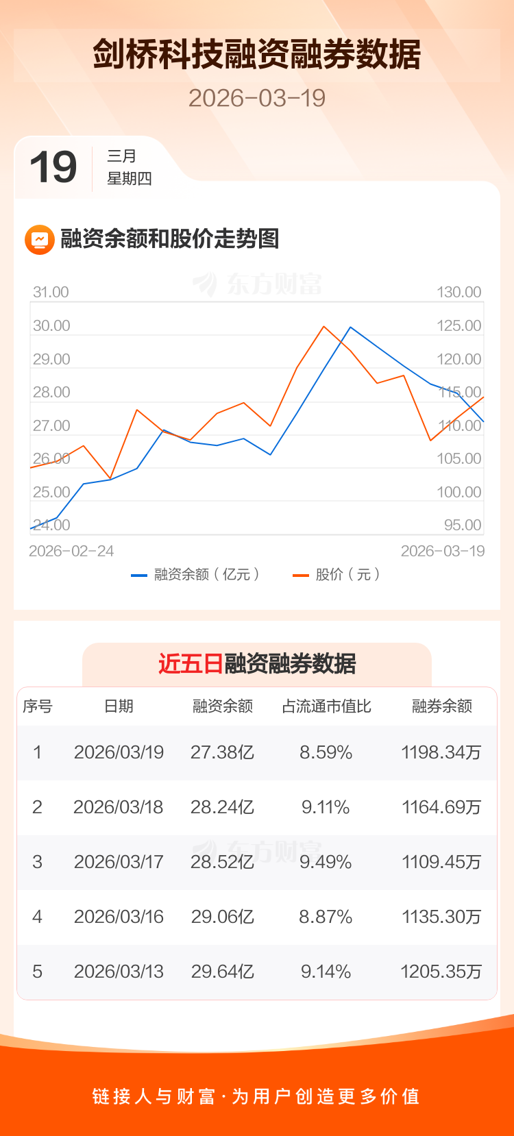 交易所最新数据显示,剑桥科技于2026年3月19日获融资买入3.06亿元,融资偿还3.93亿元,当日融资净偿还8665.89万元。目前,该股融资余额27.38亿,占流通市值比例为8.59%。