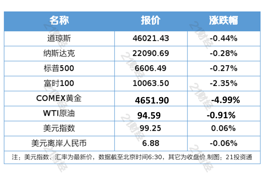 2、国际贵金属期货普遍收跌,COMEX黄金期货跌4.99%报4651.90美元/盎司,COMEX白银期货跌6.16%报72.81美元/盎司。美联储偏鹰表态打消降息预期,美债收益率、美元走强抬升贵金属持有成本,叠加避险资金偏好美元资产、流动性收紧预期升温,共同压制贵金属走势。