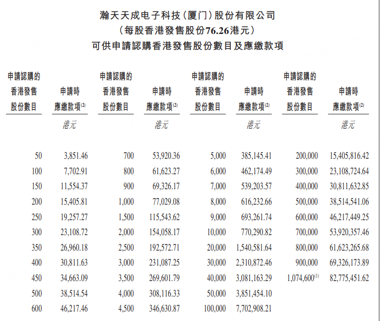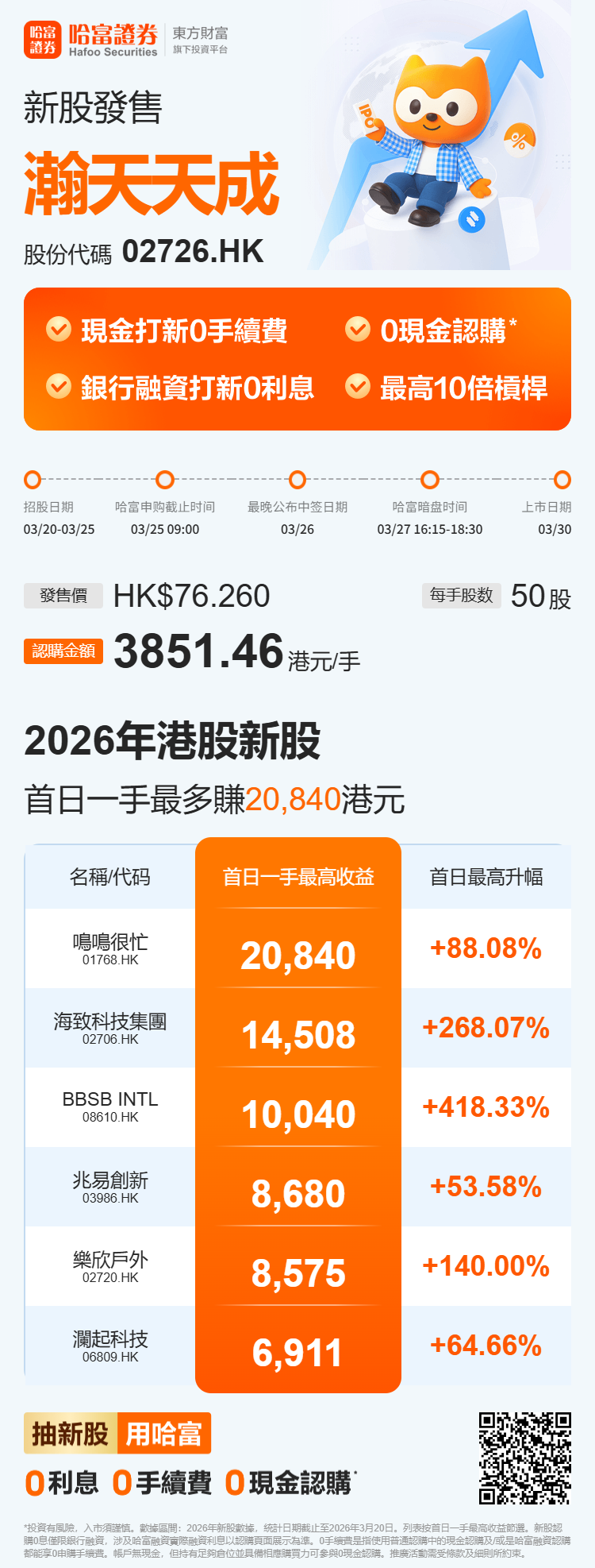 瀚天天成(02726)今日(2026年3月20日)至2026年3月25日招股,拟全球发售2149.21万股H股,其中香港公开发售占约10%,国际发售占约90%。每股发售价76.26港元,每手50股H股,一手入场费3851.46港元,预计H股将于2026年3月30日(星期一)上午九时正在联交所开始买卖。