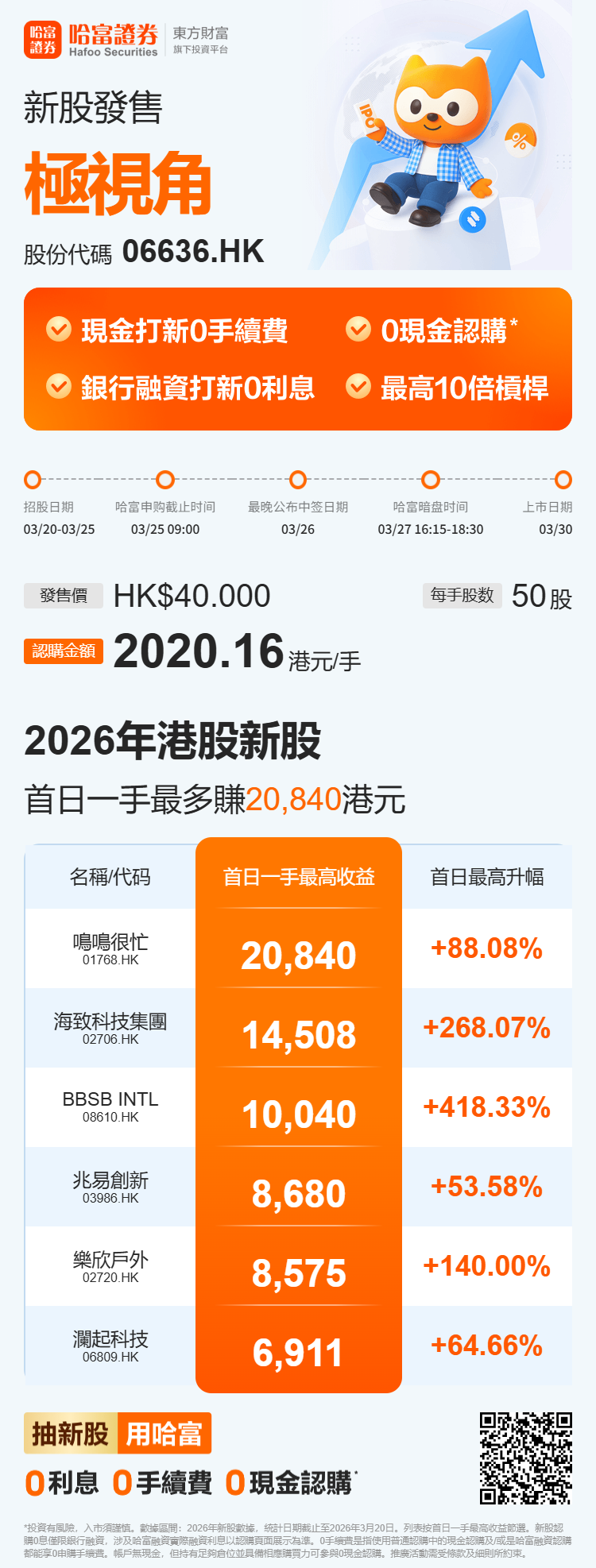 极视角(06636)于今日(2026年3月20日)至2026年3月25日招股,拟全球发售1248万股H股,其中香港公开发售占约5%,国际发售占约95%;每股发售价40港元,每手50股H股,一手入场费2020.16港元,预期H股将于2026年3月30日(星期一)上午九时正在联交所开始买卖。