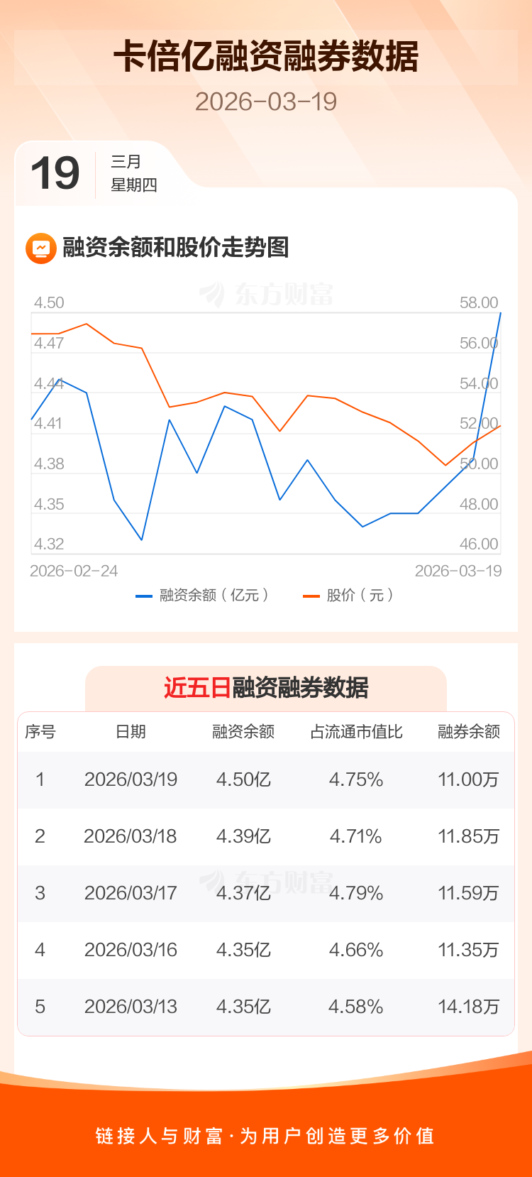 交易所最新数据显示,卡倍亿于2026年3月19日获融资买入1804.58万元,融资偿还704.23万元,当日融资净买入1100.35万元。目前,该股融资余额4.50亿,占流通市值比例为4.75%。