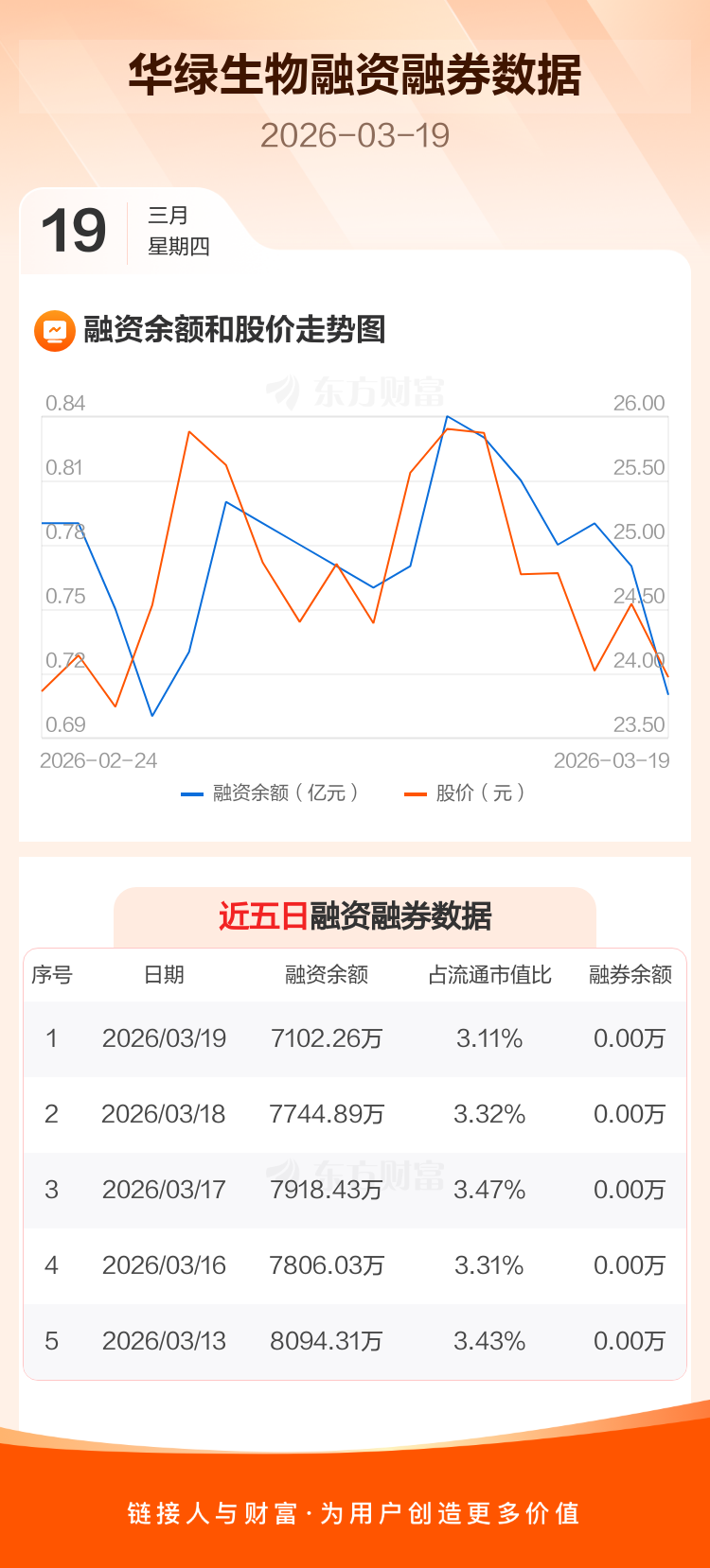 交易所最新数据显示,华绿生物于2026年3月19日获融资买入464.86万元,融资偿还1107.49万元,当日融资净偿还642.63万元。目前,该股融资余额7102.26万,占流通市值比例为3.11%。