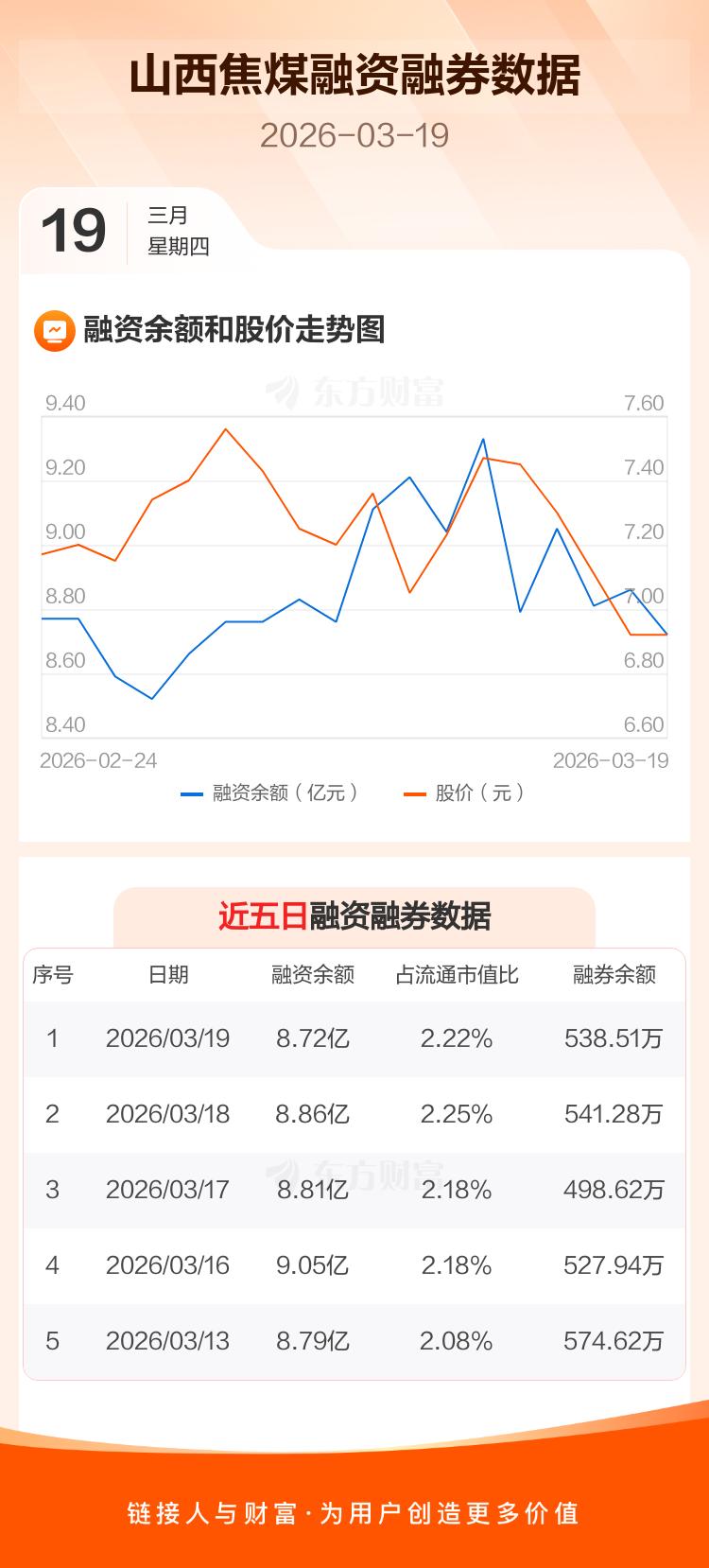 交易所最新数据显示,山西焦煤于2026年3月19日获融资买入4239.95万元,融资偿还5570.96万元,当日融资净偿还1331.01万元。目前,该股融资余额8.72亿,占流通市值比例为2.22%。