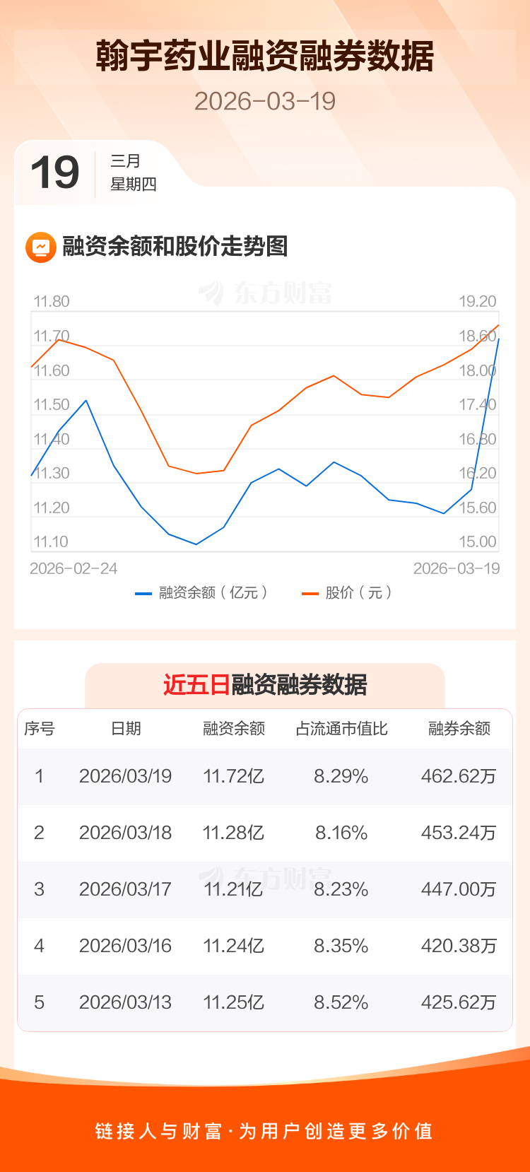 交易所最新数据显示,翰宇药业于2026年3月19日获融资买入1.08亿元,融资偿还6418.71万元,当日融资净买入4416.17万元。目前,该股融资余额11.72亿,占流通市值比例为8.29%。