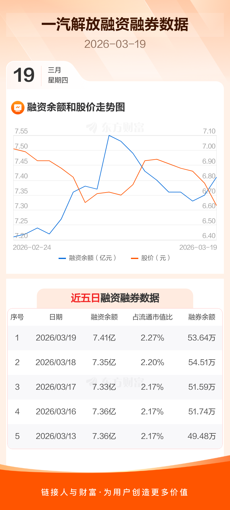 交易所最新数据显示,一汽解放于2026年3月19日获融资买入1572.90万元,融资偿还1032.06万元,当日融资净买入540.84万元。目前,该股融资余额7.41亿,占流通市值比例为2.27%。