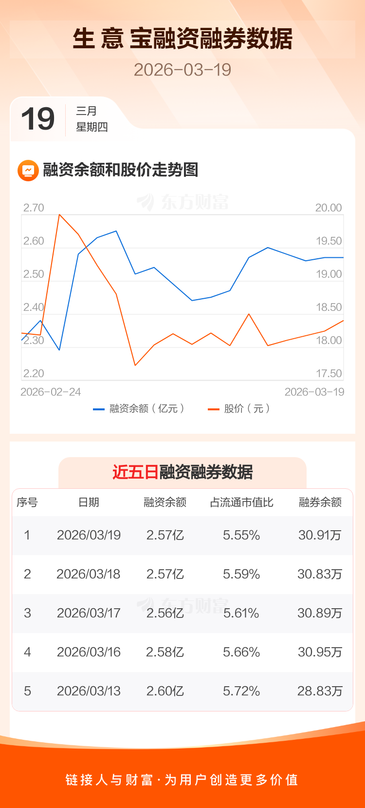 交易所最新数据显示,生 意 宝于2026年3月19日获融资买入1875.93万元,融资偿还1813.54万元,当日融资净买入62.39万元。目前,该股融资余额2.57亿,占流通市值比例为5.55%。