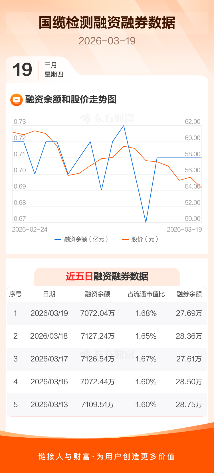 交易所最新数据显示,国缆检测于2026年3月19日获融资买入232.69万元,融资偿还287.89万元,当日融资净偿还55.2万元。目前,该股融资余额7072.04万,占流通市值比例为1.68%。