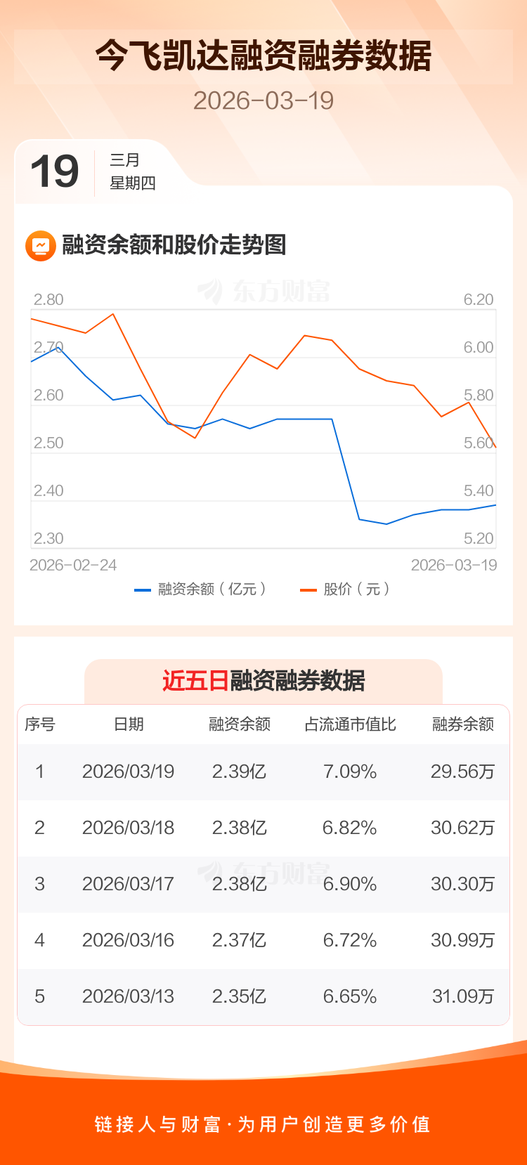 交易所最新数据显示,今飞凯达于2026年3月19日获融资买入805.86万元,融资偿还676.80万元,当日融资净买入129.05万元。目前,该股融资余额2.39亿,占流通市值比例为7.09%。