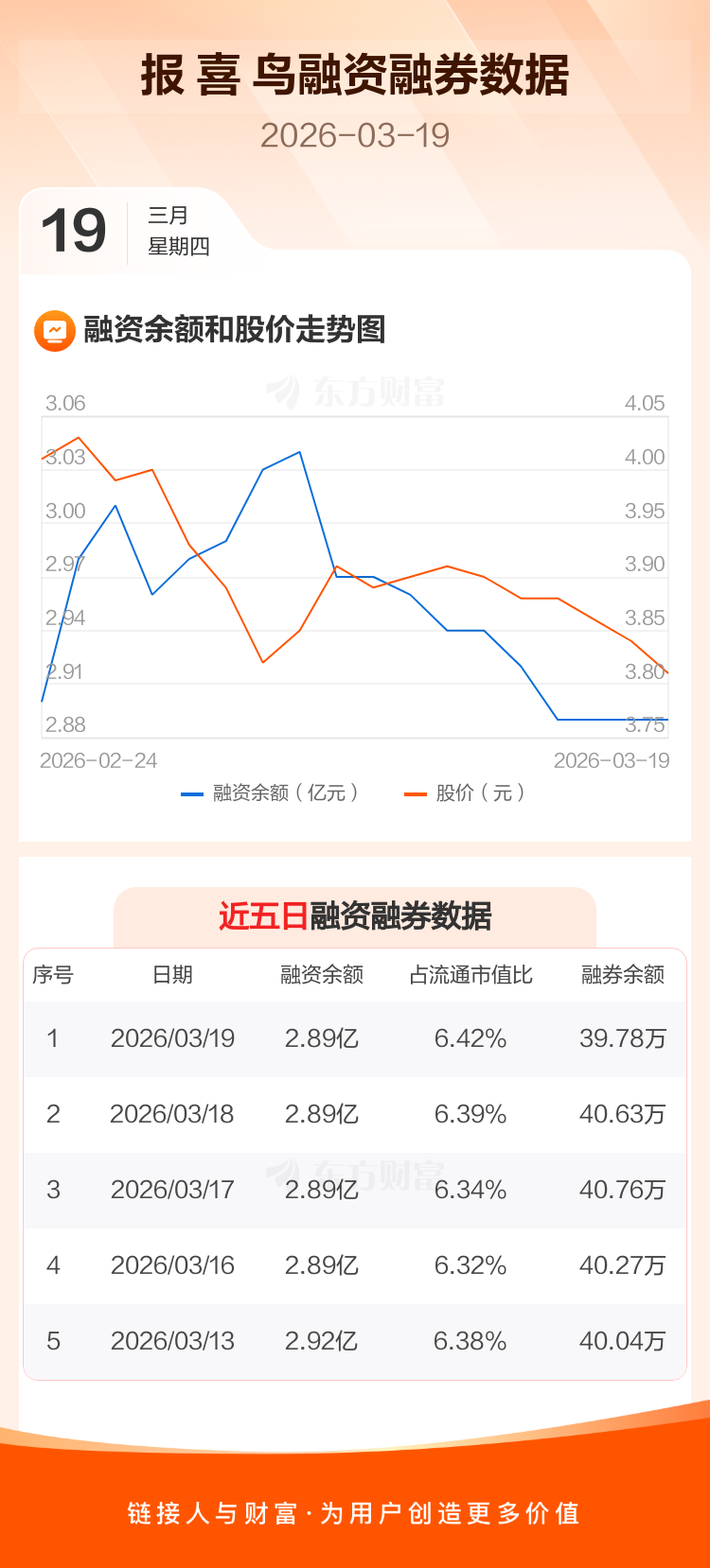 报 喜 鸟:融资净偿还66.96万元,融资余额2.89亿元
